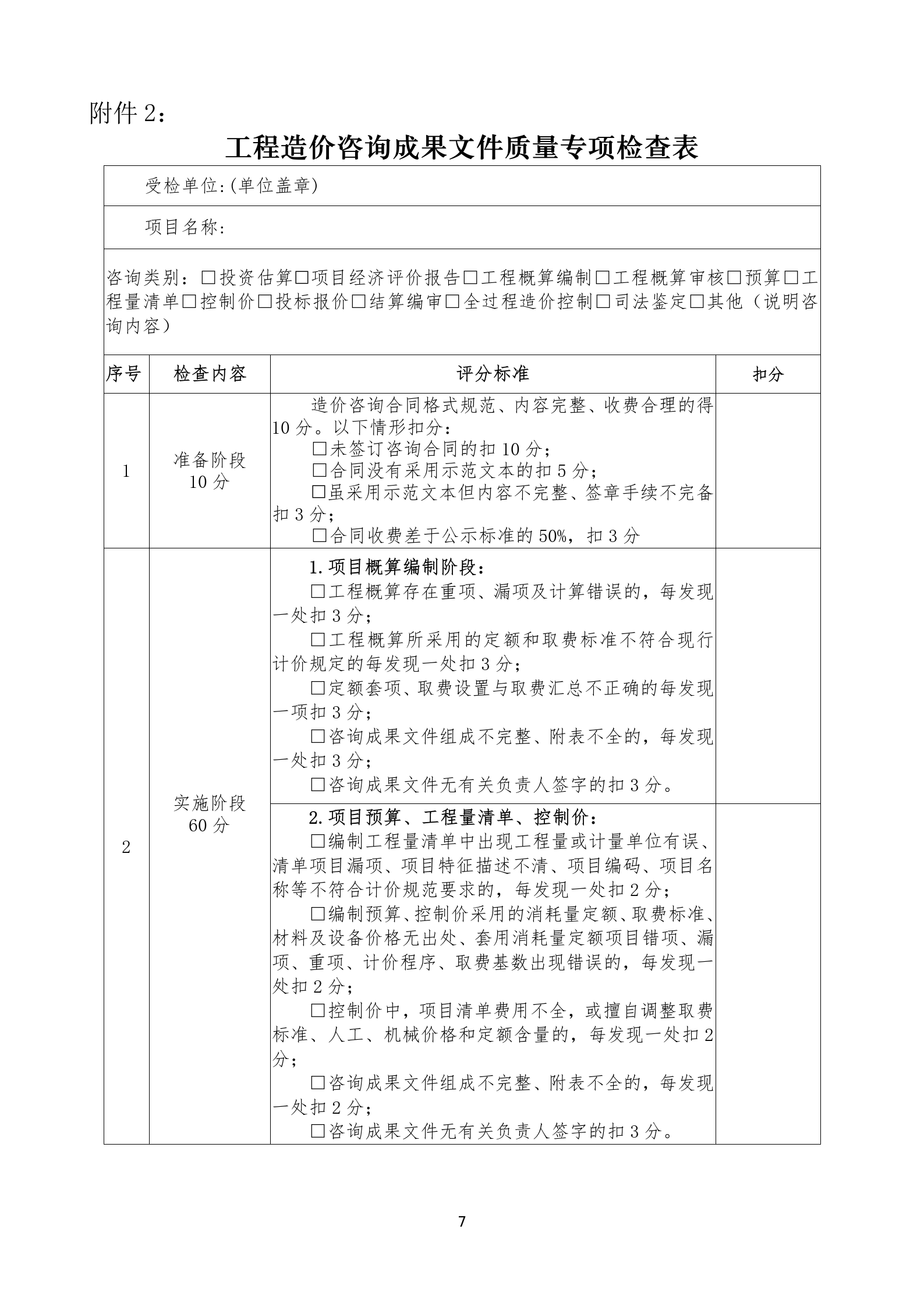 根據(jù)《工程造價咨詢成果文件質(zhì)量專項檢查表》(附件2)判定。檢查結(jié)果分為優(yōu)秀、合格、不合格。