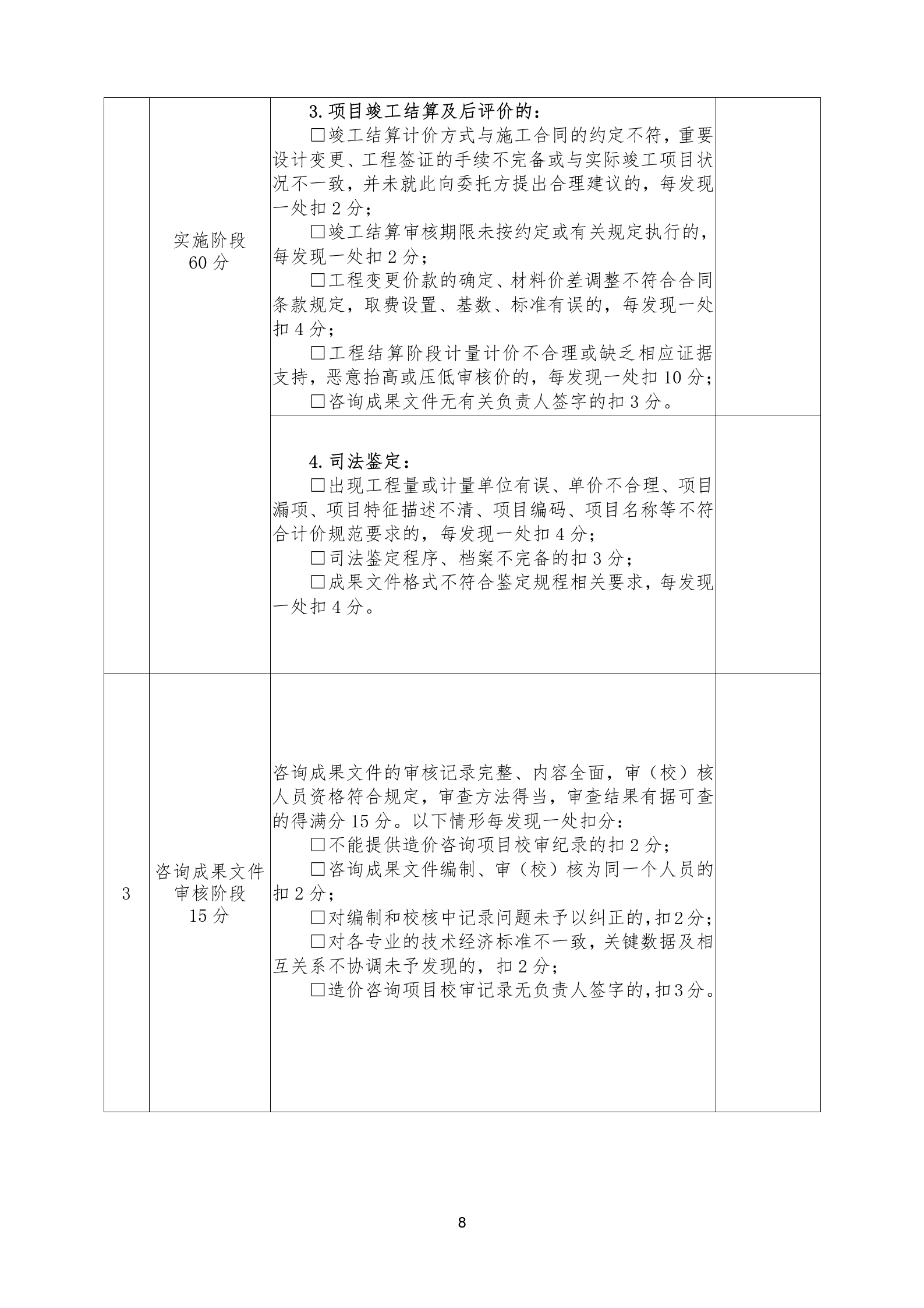 (三)不合格:工程造價咨詢企業(yè)發(fā)生過相關(guān)禁止的違法、違規(guī)行為;存在逾期未整改、整改后仍不合格,或咨詢成果文件專項檢查分值在60分以下的。