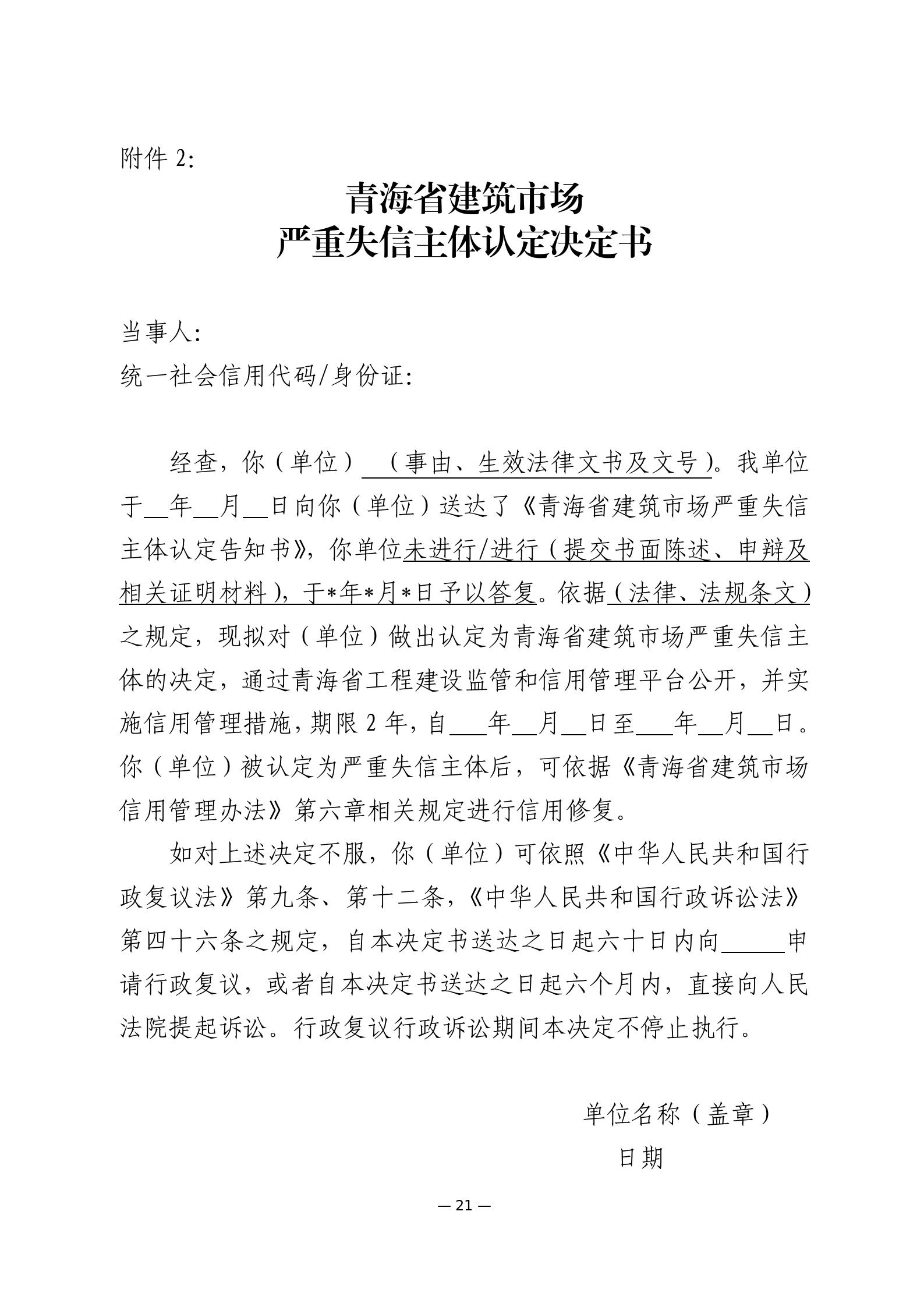 (四)住房和城鄉(xiāng)建設(shè)主管部門應(yīng)當在決定作出后10個工作日內(nèi)向當事人送達《青海省建筑市場嚴重失信主體認定決定書》(附件2)。