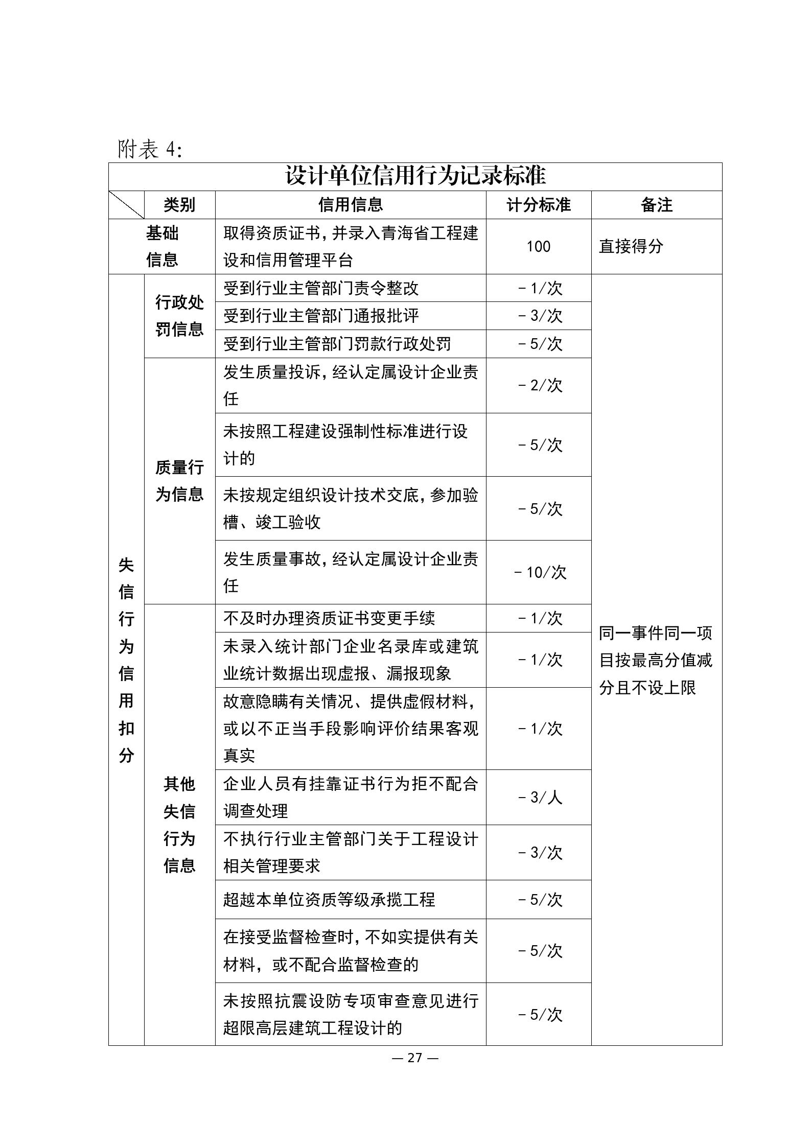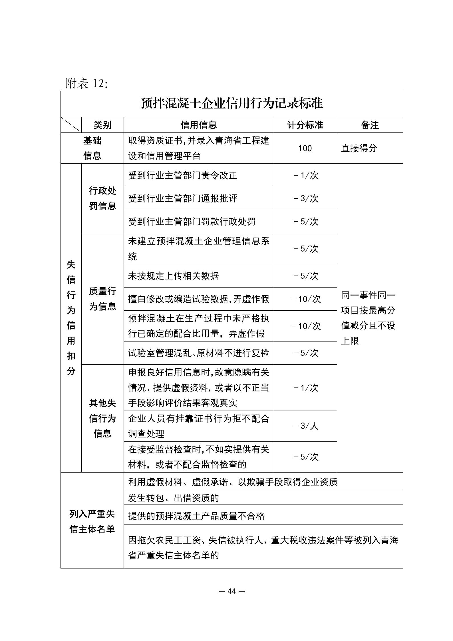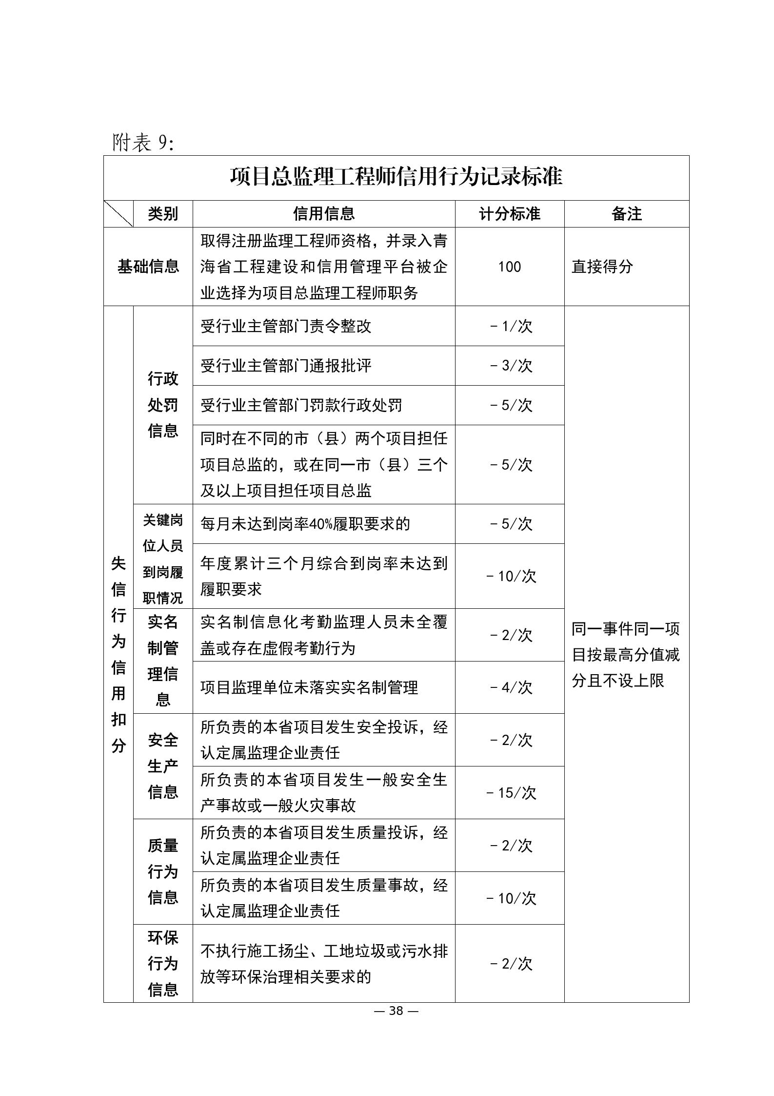 第十六條 建筑市場各方主體和從業(yè)人員的信用評價實行信用記錄、守信獎勵和失信行為動態(tài)記錄記分制。根據(jù)《青海省建筑市場各方主體和從業(yè)人員失信行為記分標準》(附件)進行公開展示和記分?;A(chǔ)分100分。